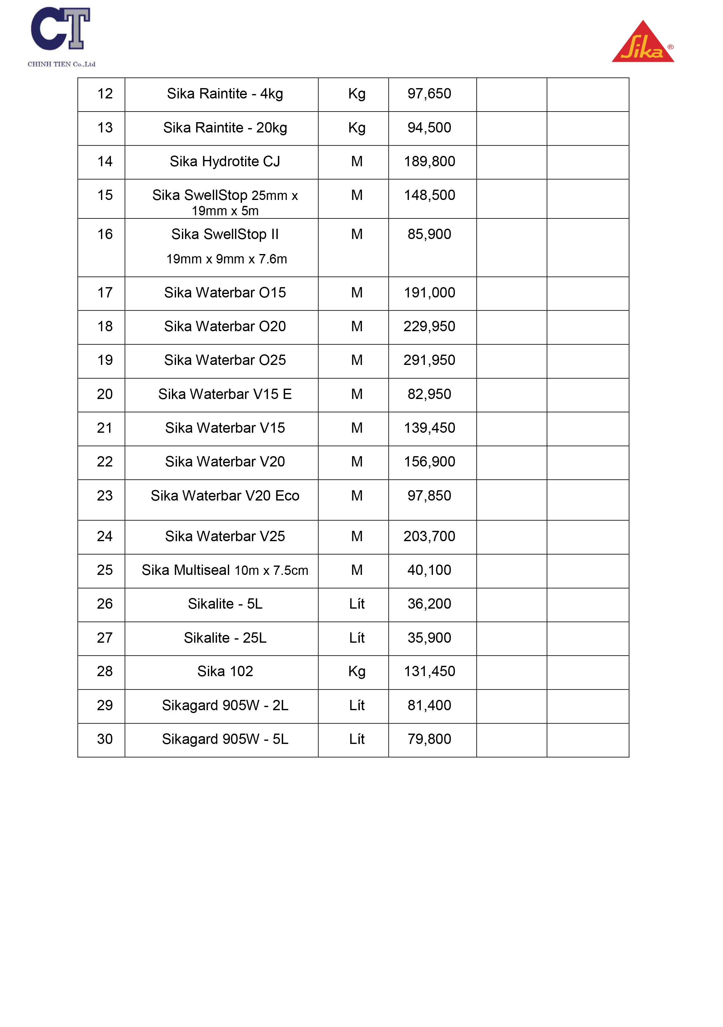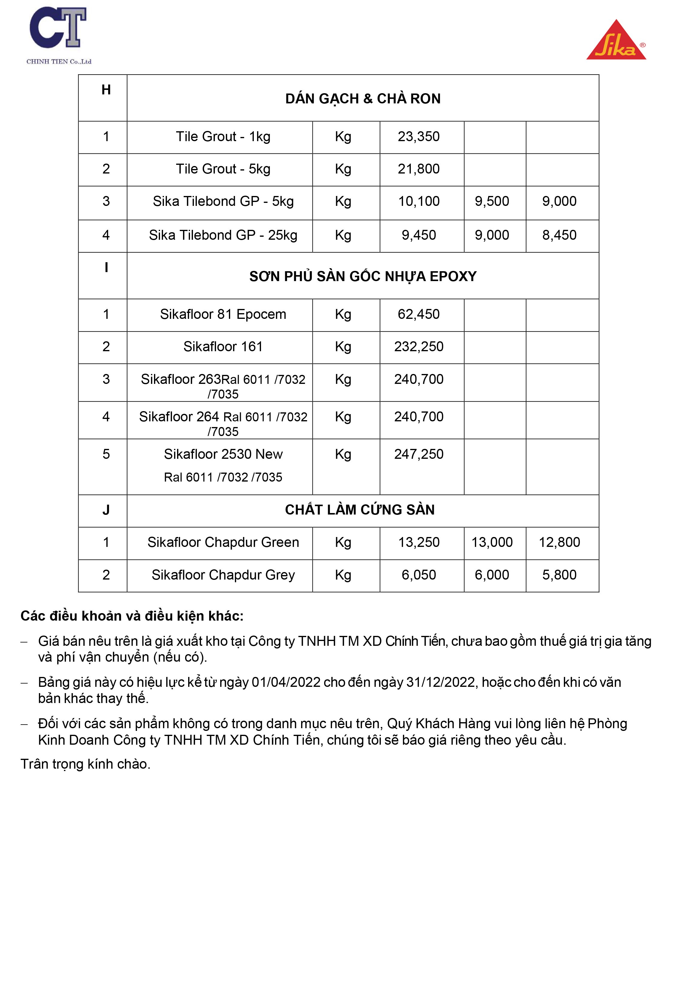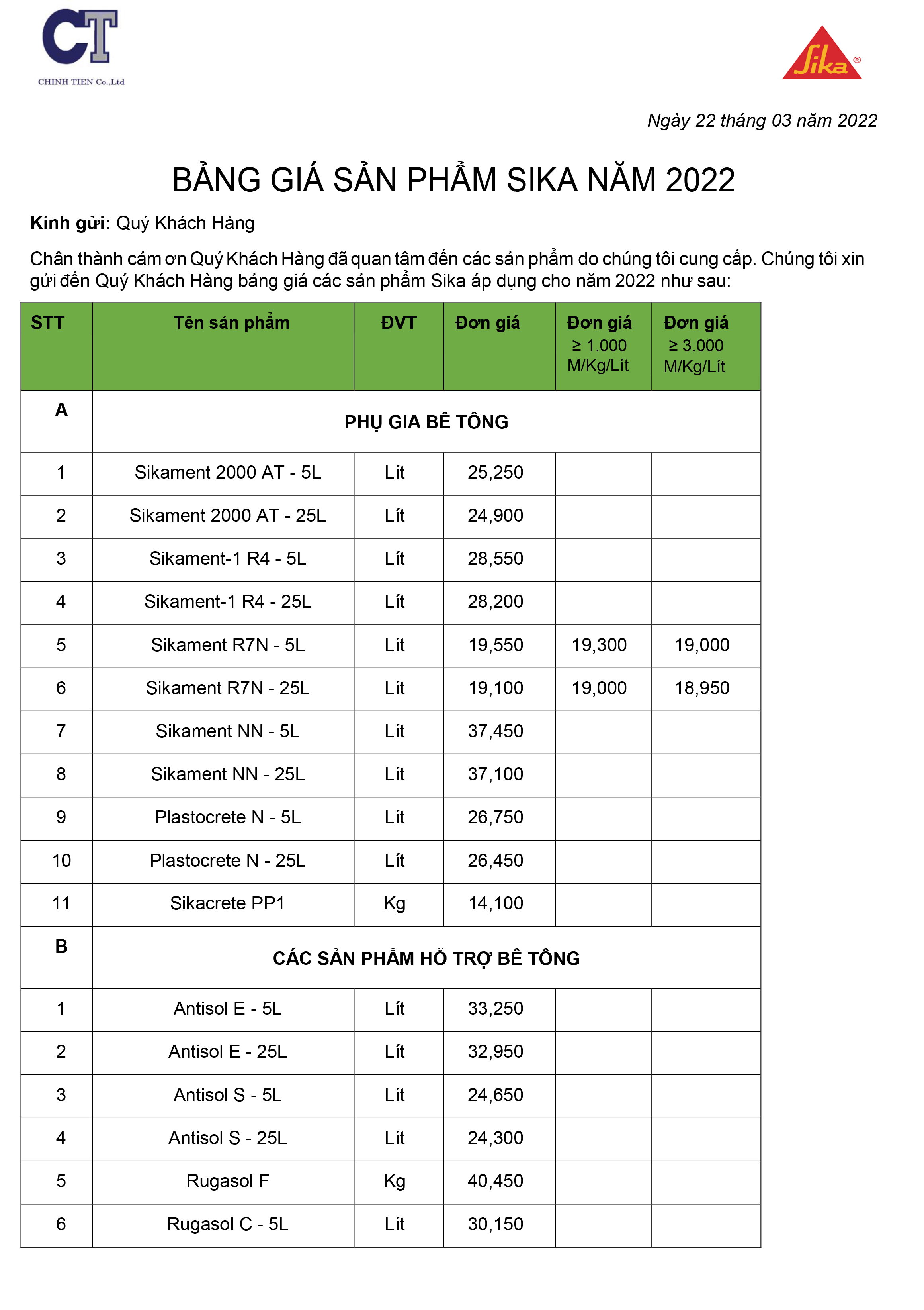 BẢNG BÁO GIÁ SIKA NĂM 2022