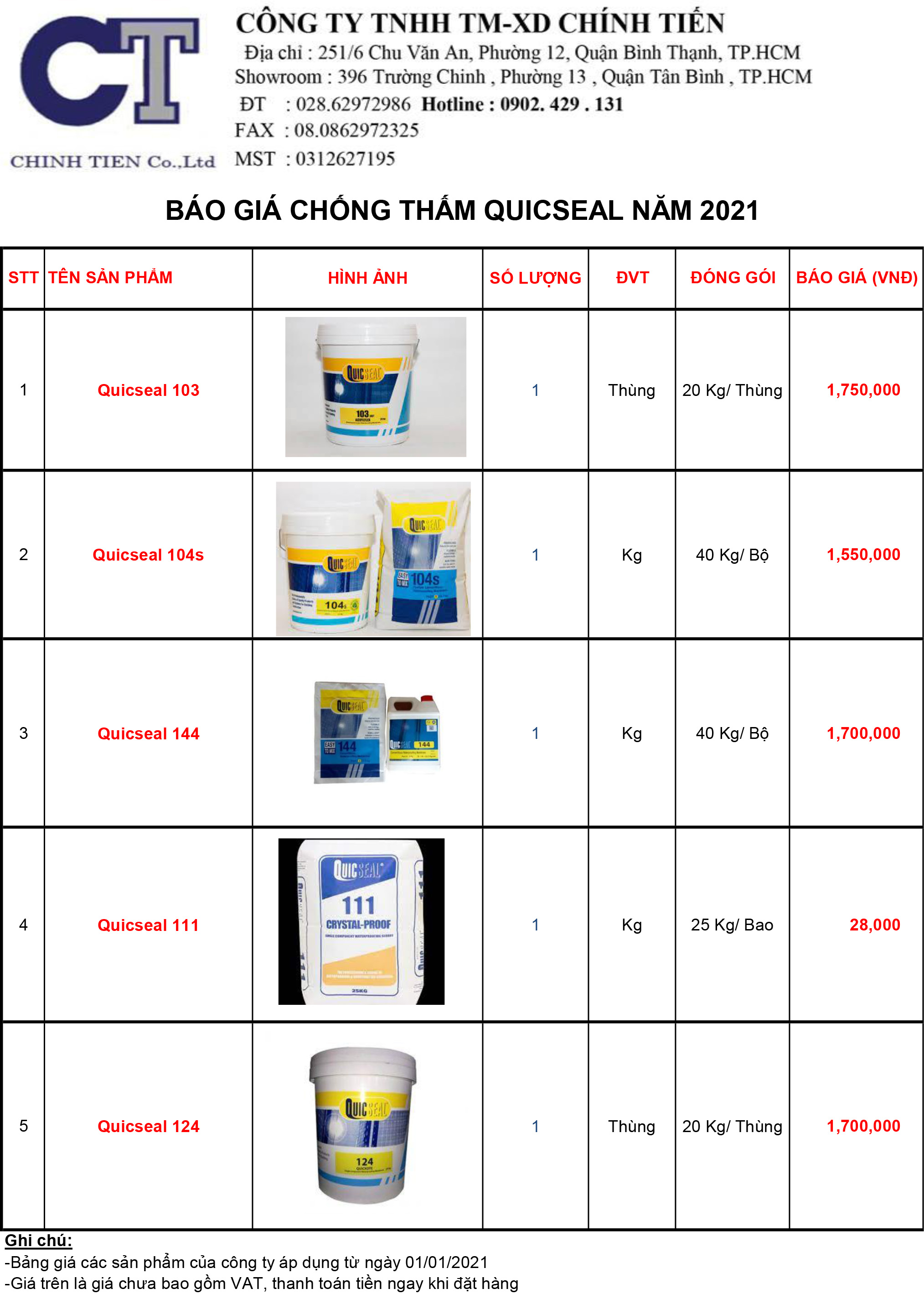 BÁO GIÁ CHỐNG THẤM QUICSEAL NĂM 2021