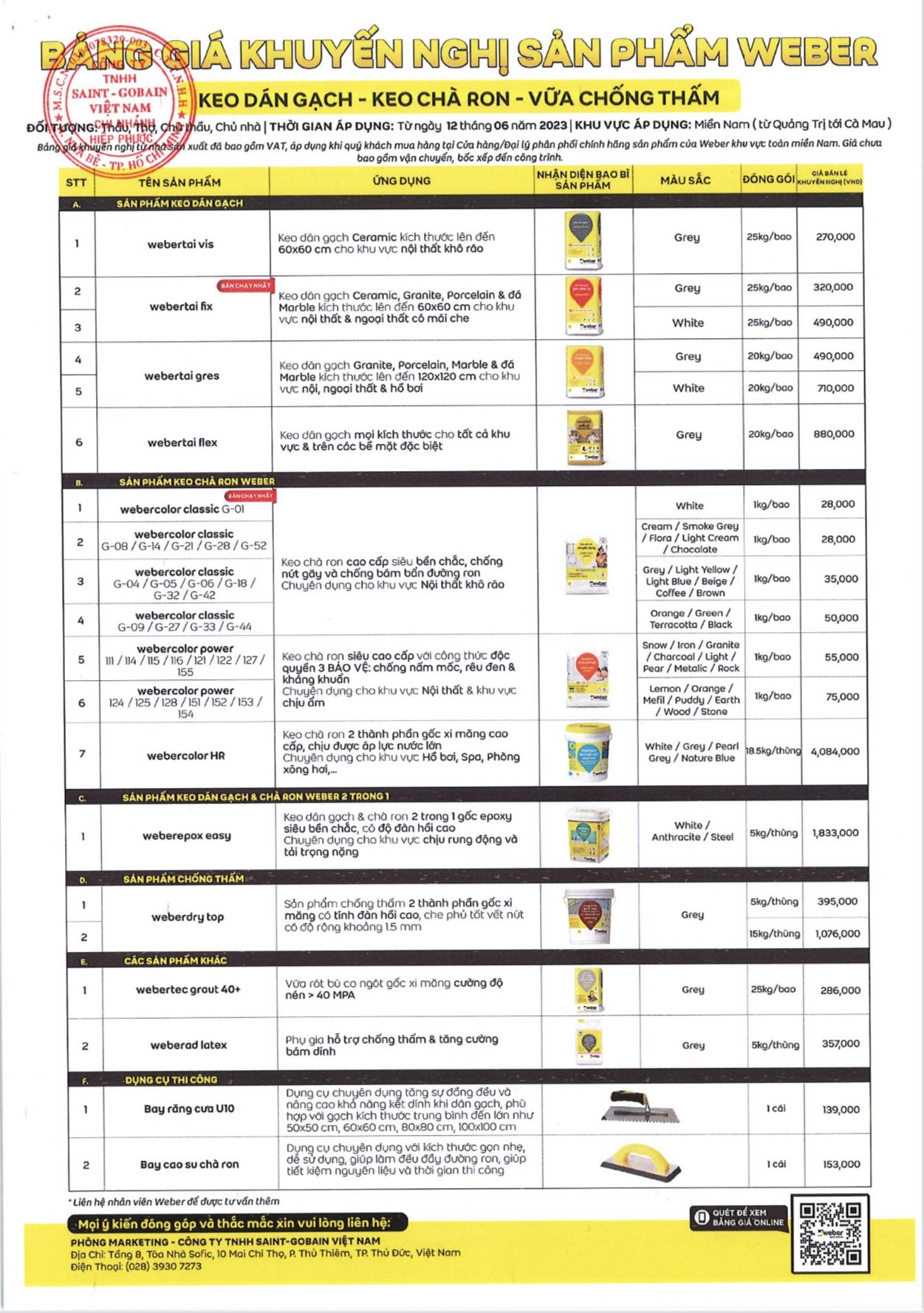 BÁO GIÁ KEO DÁN GẠCH WEBER MỚI NĂM 2023