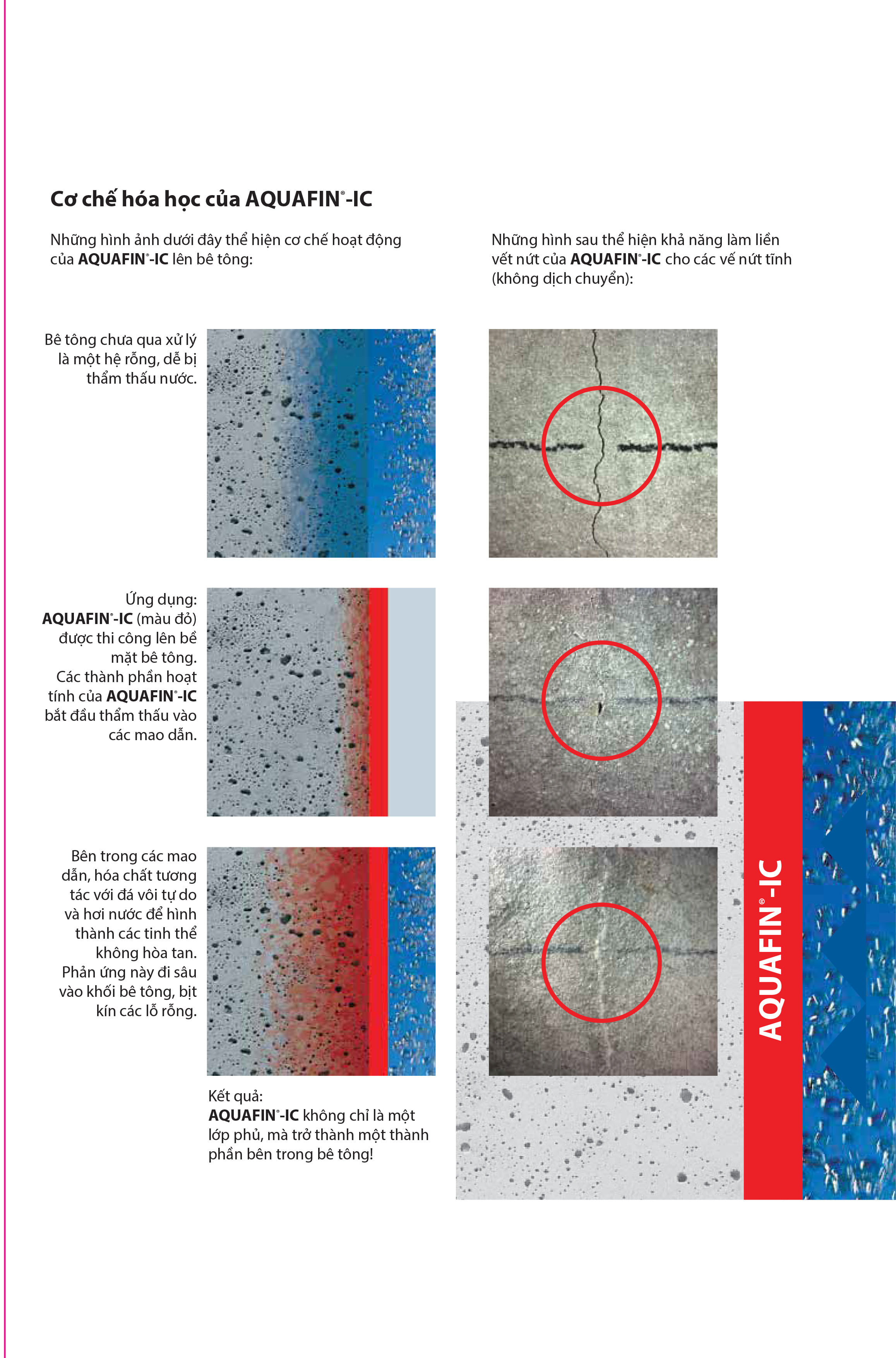 AQUAFIN® -IC chứa các hóa chất, thẩm thấu qua bề mặt bê tông, giúp cho chính bê tông trở thành thành phần tham gia chống thấm. Các đặc tính chống thấm không bị ảnh hưởng ngay cả khi lớp phủ bị dỡ bỏ một phần hoặc có vài vết nứt nhỏ sau khi thi công. Nhờ vào khả năng kháng áp lực thủy tĩnh cao (thử nghiệm lên đến 130 m [200 psi] theo bề thuận và ngược), AQUAFIN® -IC là vật liệu chống thấm hoàn hảo cho các kết cấu bê tông lớn như bể nước, hồ thu nước hay nhà máy xử lý nước thải. Những ứng dụng điển hình khác bao gồm công trình bãi đậu xe, hầm, lõi thang máy, hố ga và chống thấm cho móng và tường dưới lòng đất.