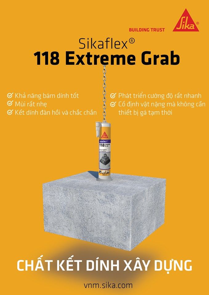 Sikaflex-118 Extreme Grab keo 1 thành phần phát triển cường độ nhanh, đàn hồi rắn chắc để cố định vật nặng, khả năng bám dính cực tốt trên mọi bề mặt vật liệu xây dựng