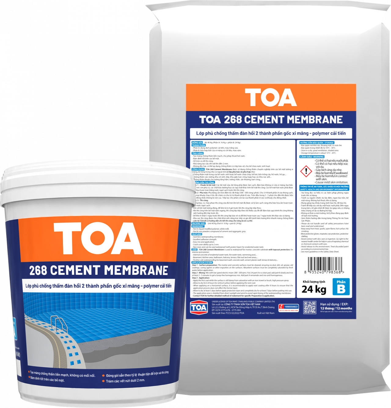 TOA 268 Cement Membrane là sản phẩm chống thấm 2 thành phần đóng gói sẵn. Phần A là polymer cải tiến dạng lỏng, phần B là hỗn hợp bột của xi măng, cốt liệu mịn chọn lọc và phụ gia đặc biệt. Hai thành phần này khi trộn lại kết hợp tạo thành một dung dịch dạng vữa lỏng thuận tiện cho việc thi công trên bề mặt vữa, bê tông để tạo thành một lớp phủ đàn hồi cao có tính năng chống thấm và bảo vệ.
